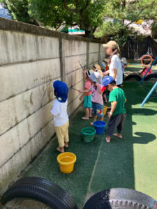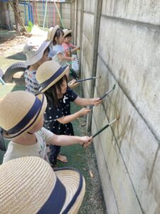泥の感触が気持ちいいね。水を使って、塀にお絵かきもしました。だんだん乾くと消えてく様子が楽しかったね!