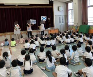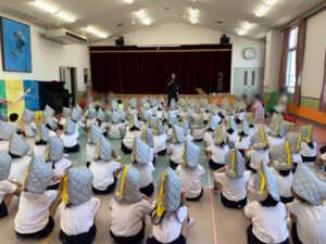 幼稚園では定期的に訓練を重ね、冷静に対応すること。命を守る行動をとれるように取り組んでいます。
