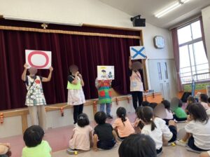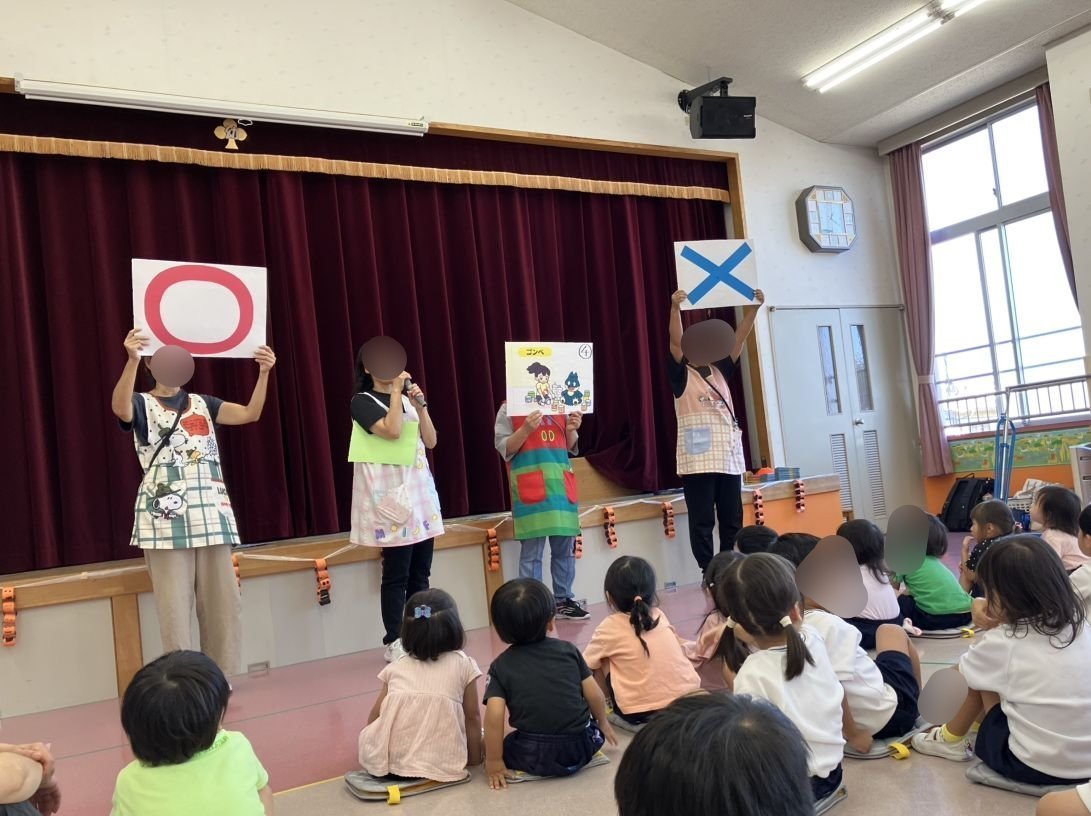 避難訓練のあとは、水害や台風、雷などの時の安全な行動を考える◯✕クイズをしました。