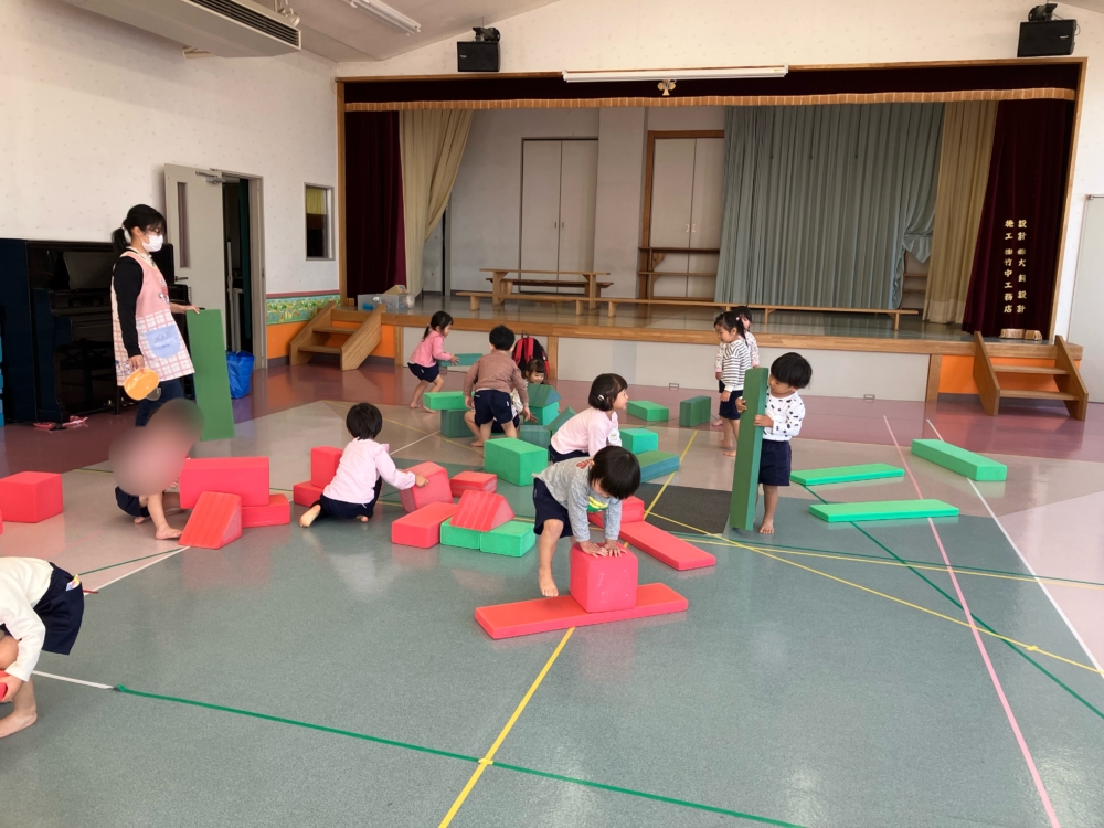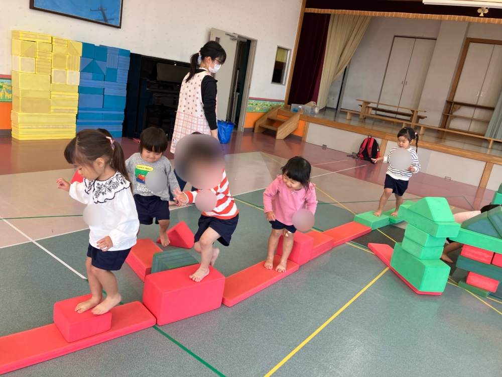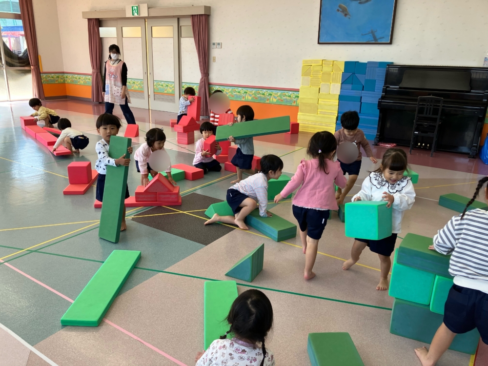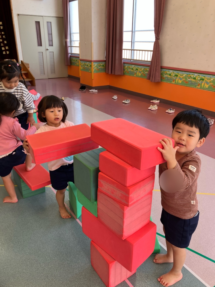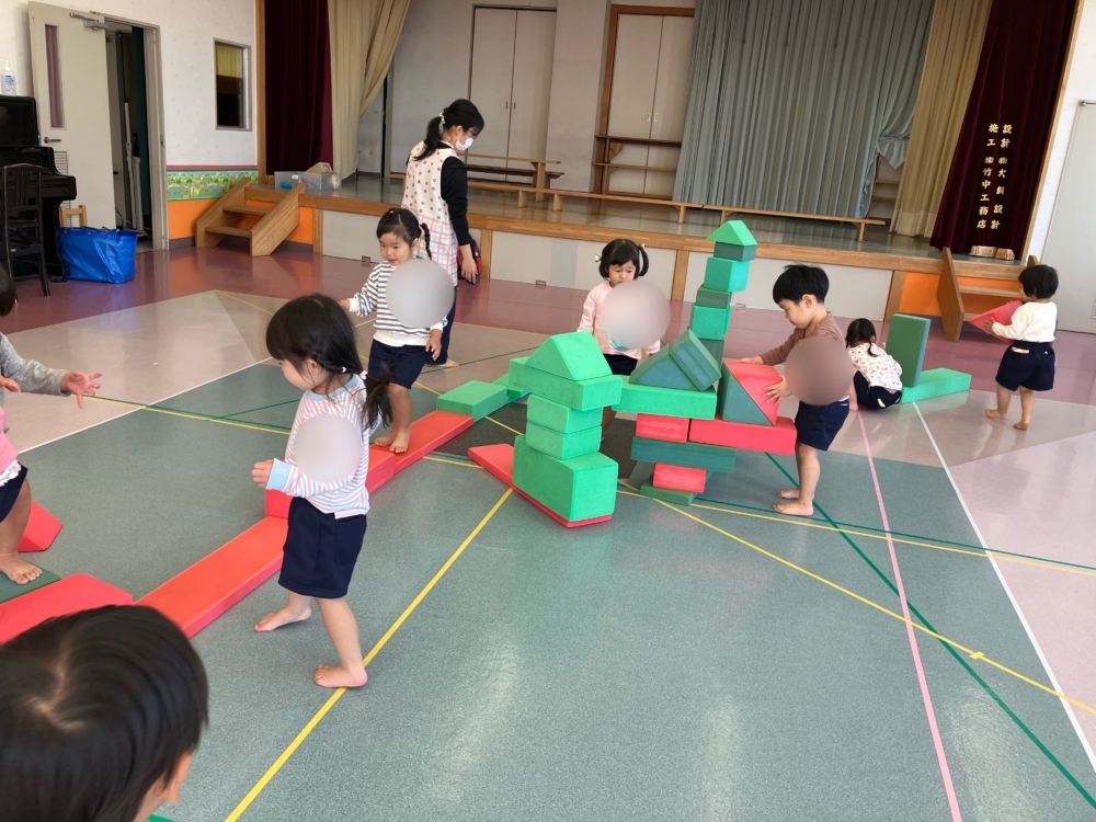 お遊戯室では、巨大ブロックを使って遊びました。お友達と協力して一緒にお家🏠をつくってみたり、自分たちで橋のように並べて落ちないように渡ってみたり😊