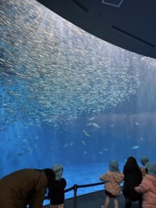 子ども達は目をキラキラさせながら水槽を見ていました。「みてみてー!」「この魚はなぁに?」と子ども達は興味津々です🐠
